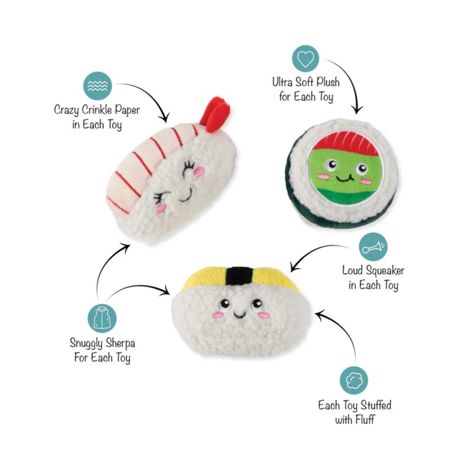 Hoe leuk is dit sushi setje voor de hond? het bevat 3 speeltjes met squeakers en kraakpapier!