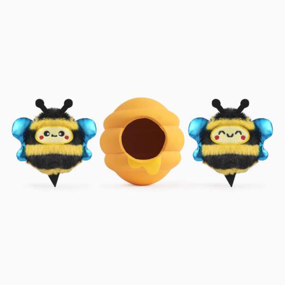 Een leuk 3 in 1 speeltje, een bijenkorf van latex met plek voor 2 leuke pluche bijtjes.