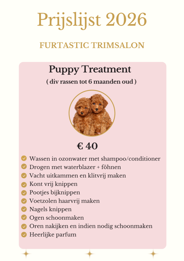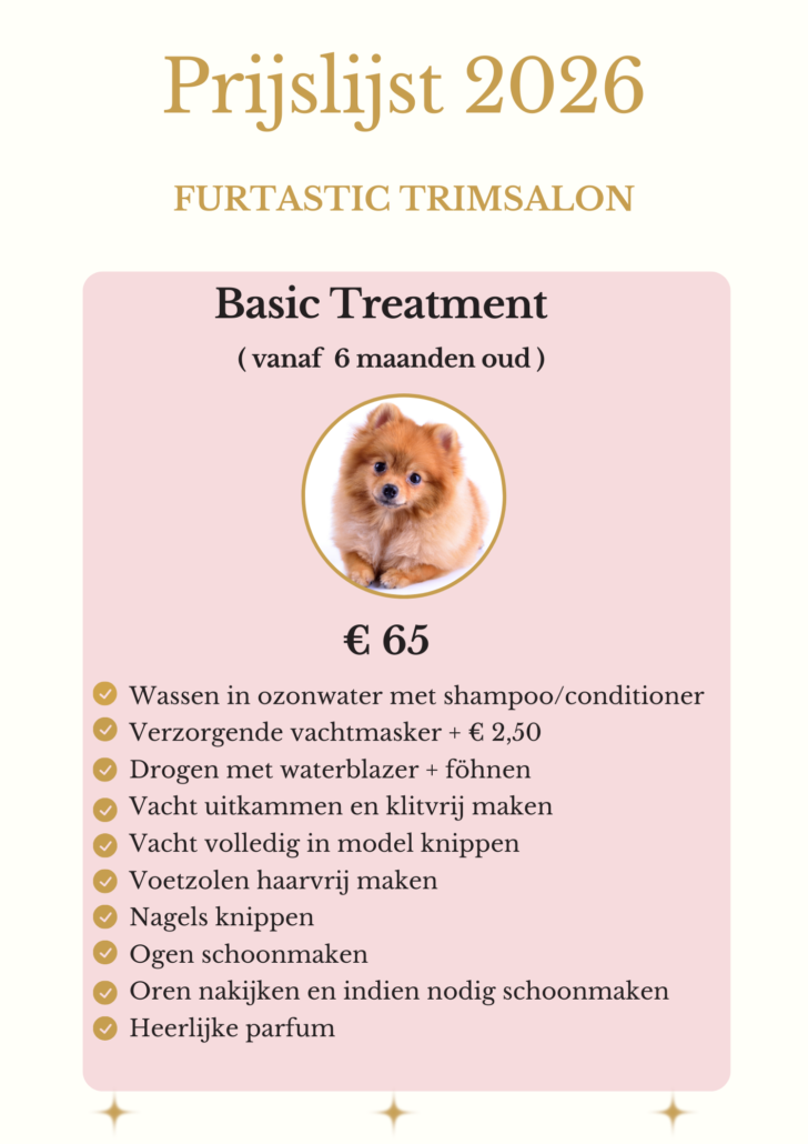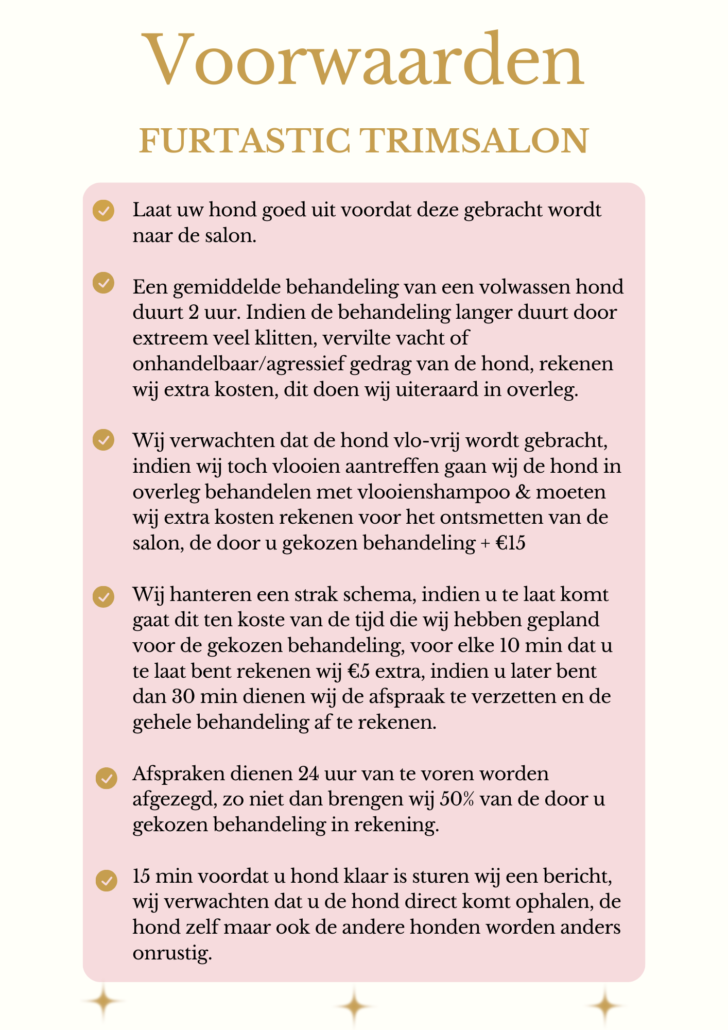 Bij ons staat het welzijn van dieren voorop, wij doen slechts 1 hond per keer, zodra deze klaar is komt de volgende, wij doen dit om stress en angst bij honden te voorkomen, een salonbezoek moet natuurlijk wel leuk blijven!